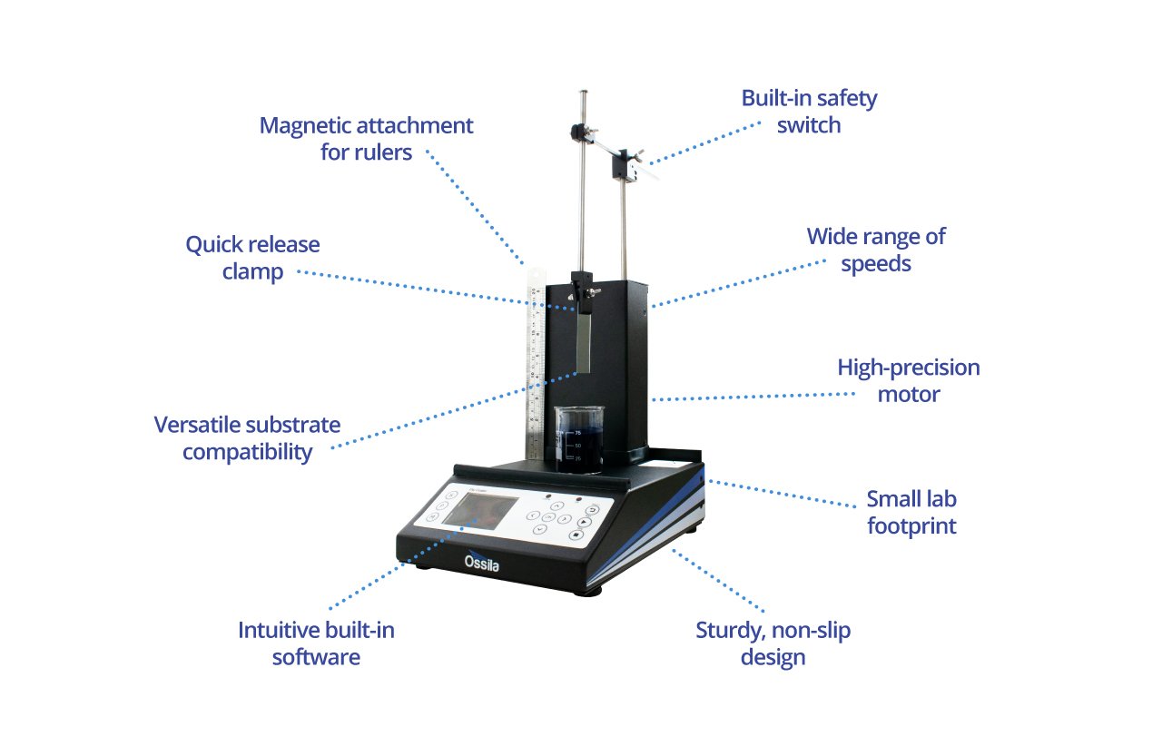− An toàn tích hợp: Đảm bảo mức độ an toàn cao nhất, Dip Coater có hệ thống phát hiện sự cố được tích hợp trong phần mềm. Điều này sẽ phát hiện khi chất nền hoặc đòn nâng chạm đế của máy tráng hoặc cốc thủy tinh. Khi phát hiện, động cơ sẽ dừng lại. Điều này làm giảm khả năng làm hỏng mẫu, cốc thủy tinh hoặc thiết bị nhúng phủ của chính bạn.