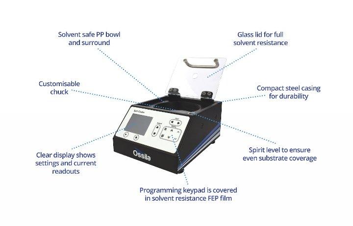 − Bảo trì thấp: Hệ thống sơn phủ sử dụng máy hút bụi dễ bị hư hỏng và có quy trình sửa chữa phức tạp. Ossila Spin Coater có số lượng yêu cầu tối thiểu các bộ phận chuyển động, không có chân không