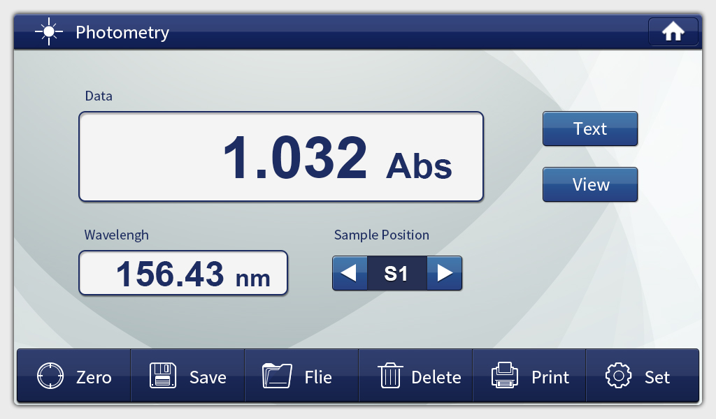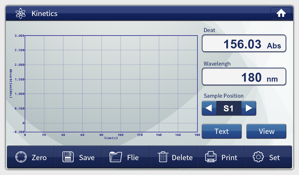 − Đo lường động học (Quét thời gian): kiểm tra quá trình phản ứng hóa học mẫu bằng phương pháp quét dung dịch mẫu với bước sóng cố định theo thời gian định sẵn. Thiết bị có thể tính toán tốc độ thay đổi của nó sau khi nhập các thông số tương ứng.