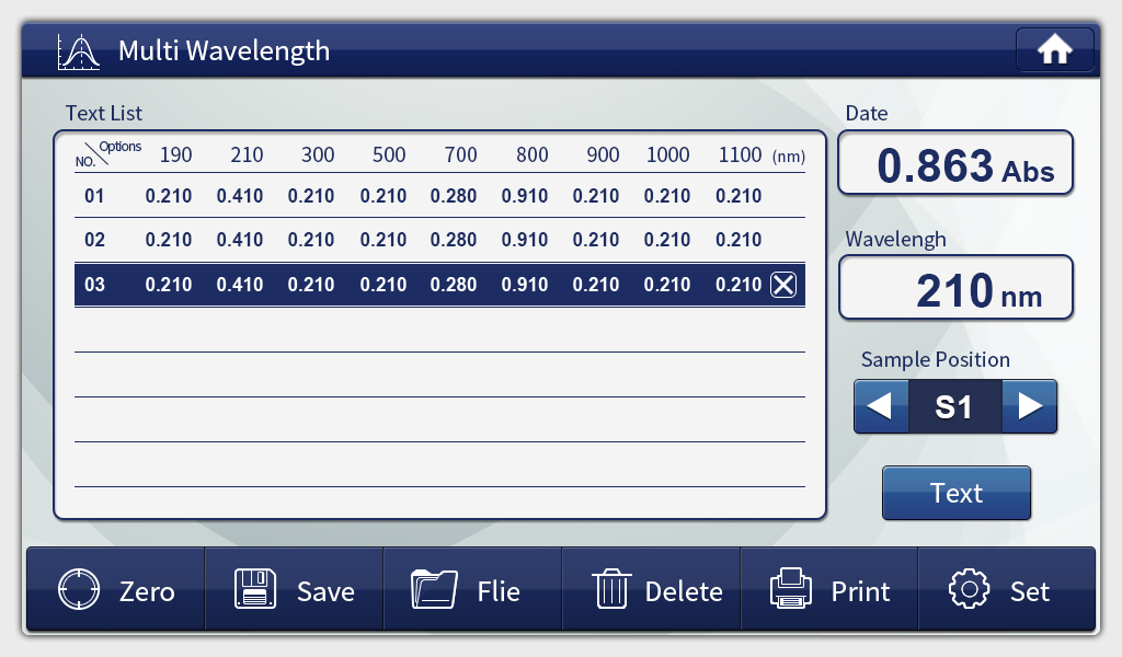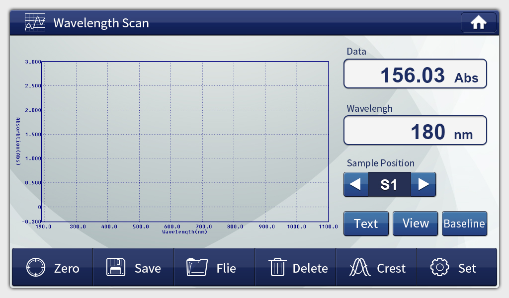 − Quét theo bước sóng (Kiểm tra định tính): Để kiểm tra đỉnh độ hấp thụ của dung dịch mẫu, có thể quét trong dải bước sóng từ 190 đến 1100nm. Bạn có thể tra cứu độc lập giá trị đỉnh trên thiết bị.