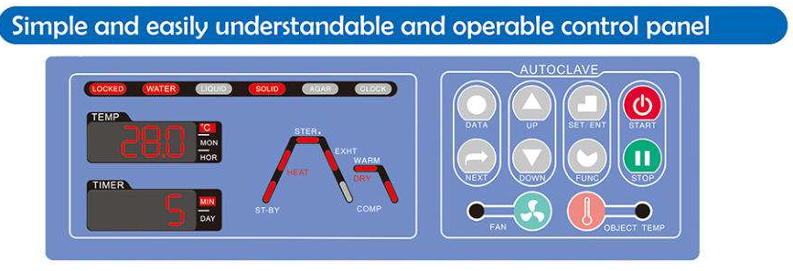 - Lưu trữ: Cài đặt trước 6 qui trình hấp tiệt trùng và quy trình ủ ấm, làm khô chất rắn và chất lỏng, hòa tan và ủ ấm Agar. Thiết lập lên tới 60 chu trình và lưu để dễ dàng sử dụng.