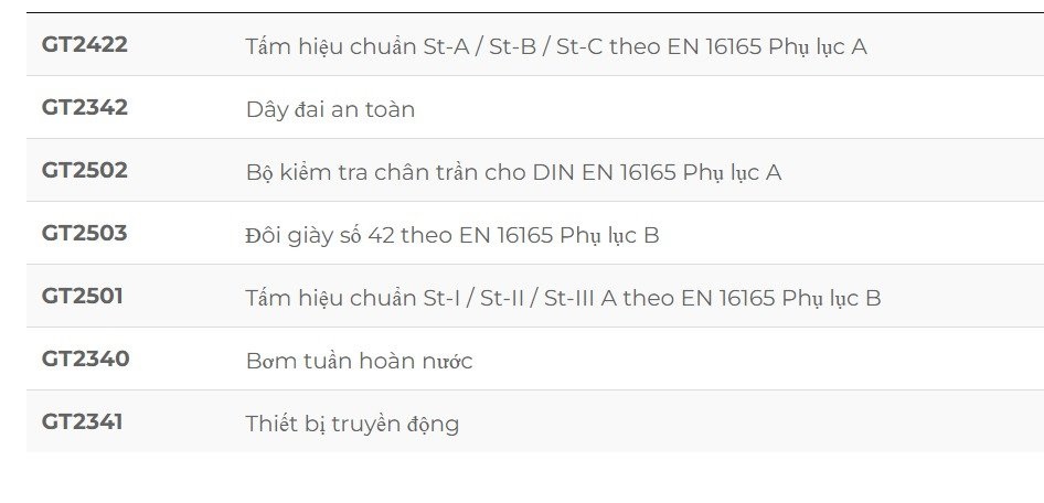 - Thang lên sàn thử nghiệm với chân trần DIN EN 16165 Phụ lục A phải đặt hàng riêng.