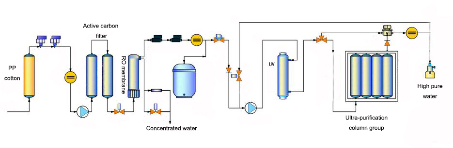 − Cuối cùng, để có được nước tinh khiết cao với độ dẫn thấp (1 micro Siemens trên mỗi cm), nhóm cột siêu tinh khiết được trang bị, trao đổi các anion và cation với các ion hydroxit và ion hydro.